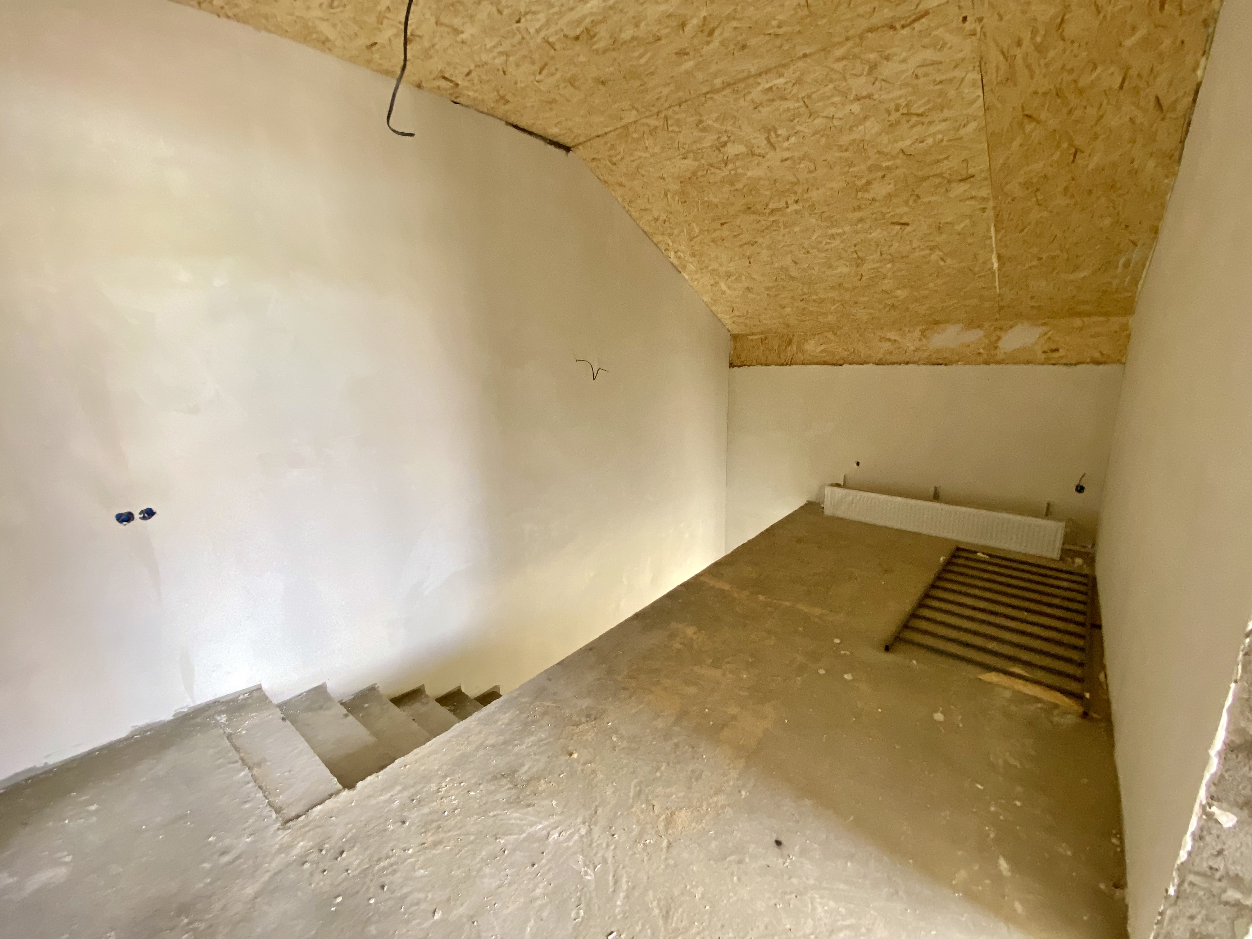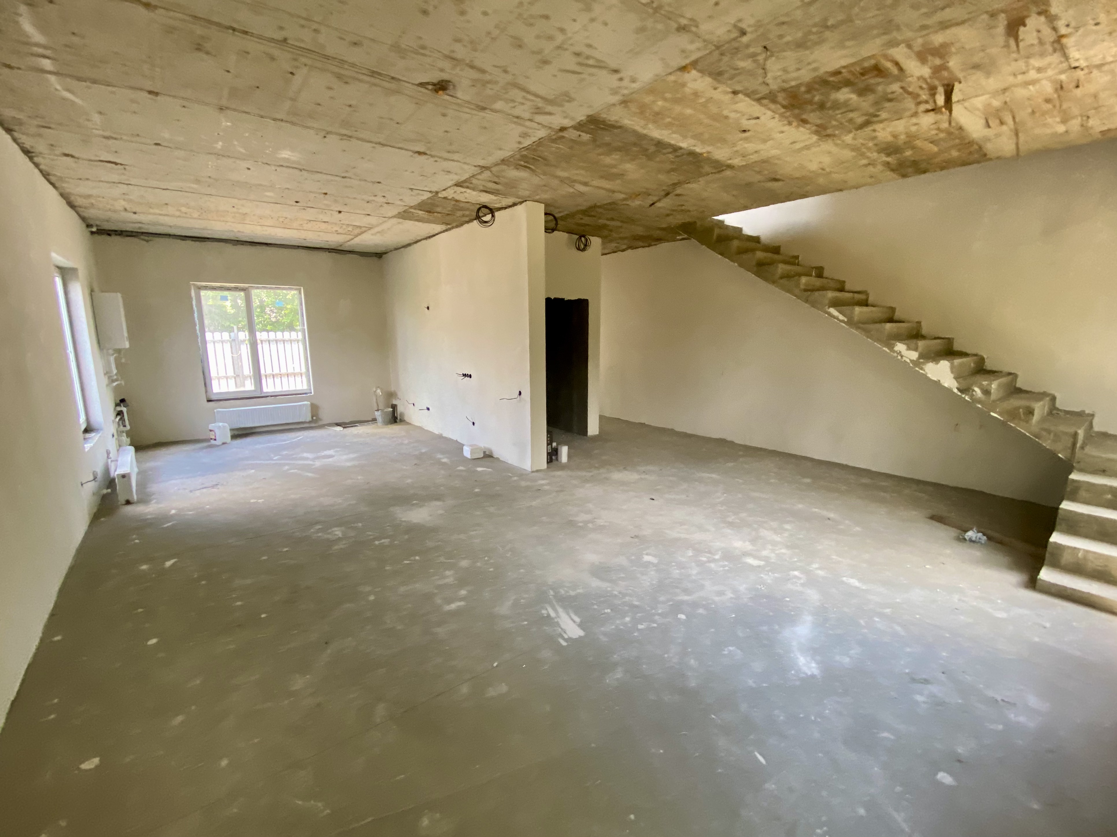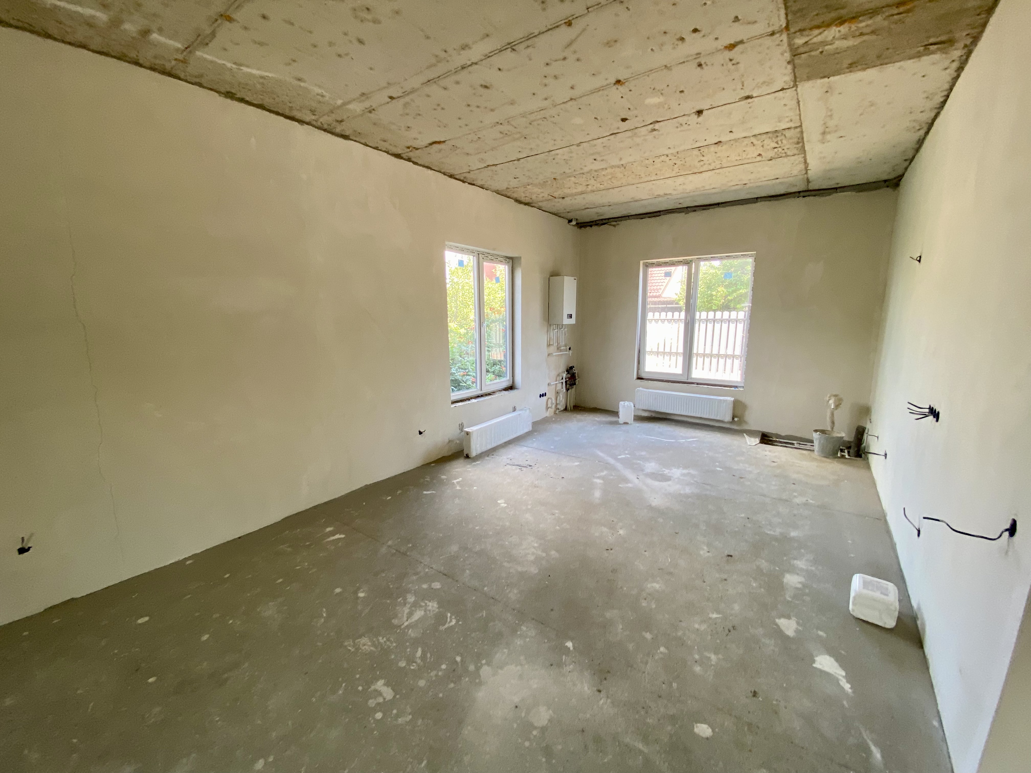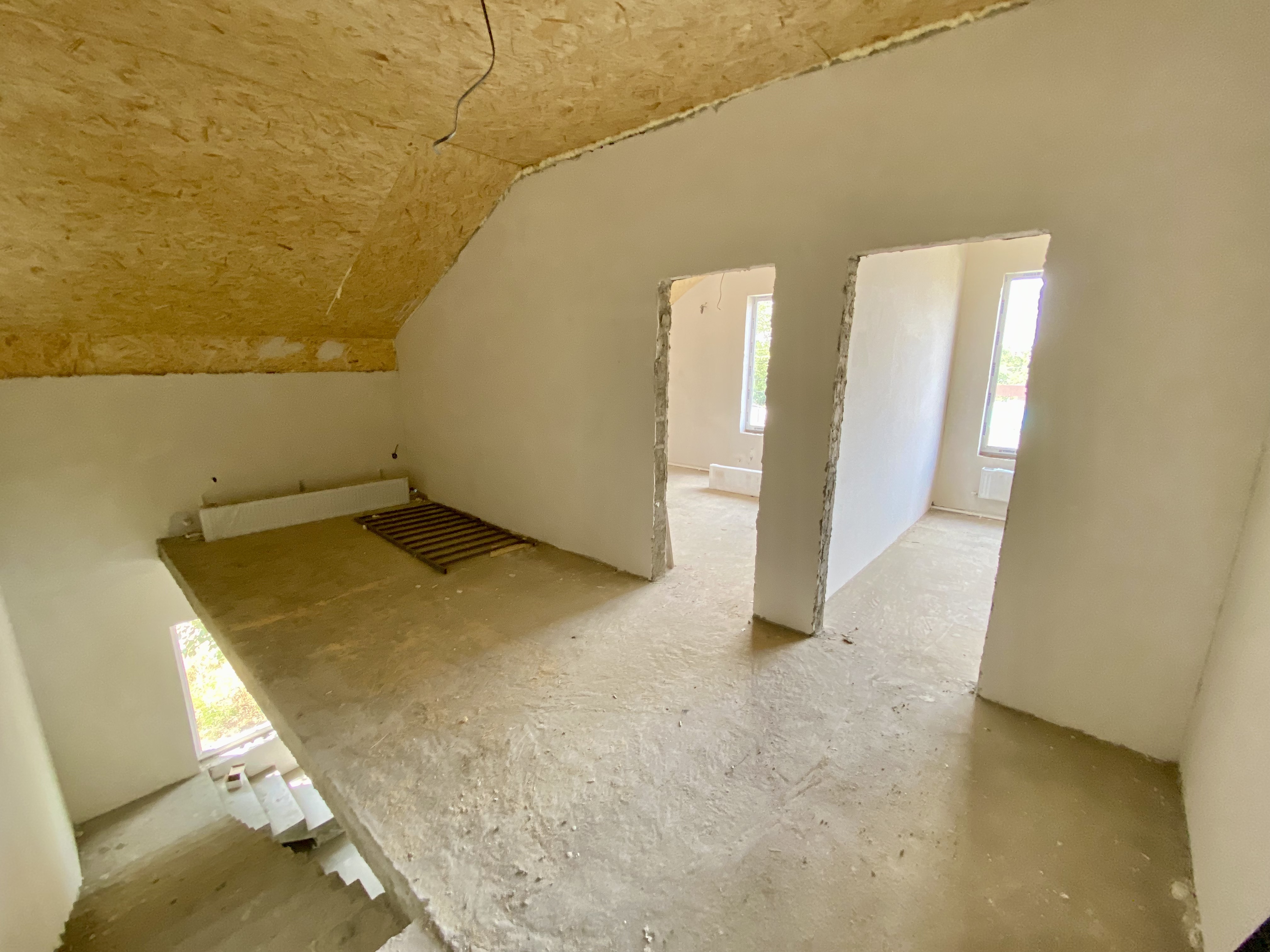 Продается коттедж. Два этажа, на первом этаже большая кухня-гостиная, санузел, на втором две жилые комнаты и санузел. Сделан теплый пол и стяжка, разведена электрика, отопление, установлены радиаторы и двухконтурный котел.